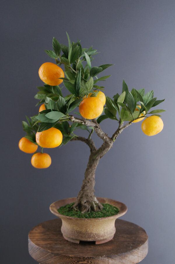 細部まで丁寧に作りこまれた幹も枝もみかん一つひとつの皮の表面まで、至近距離から本物と見分けがつかないほどのリアルな仕上がりです。